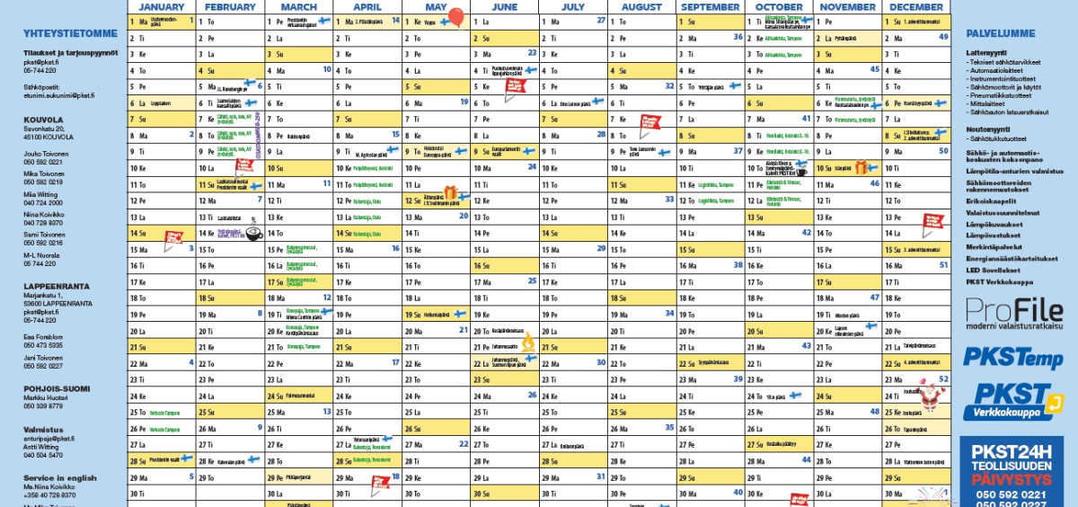 Vuoden 2024 A2 kokoiset seinäkalenterit ovat nyt jaossa! Kalenteri on tuotettu ja painettu Kouvolassa paikallisia yrittäjiä tukien. Voit noutaa omasi veloituksetta myymälöistämme Kouvolasta ja Lappeenrannasta, tai tilata PKST verkkokaupasta. https://kauppa.pkst.fi/epages/pkst.sf/fi_FI/?ObjectPath=/Shops/18032009-133761/Products/Sein%C3%A4kalenteri2024